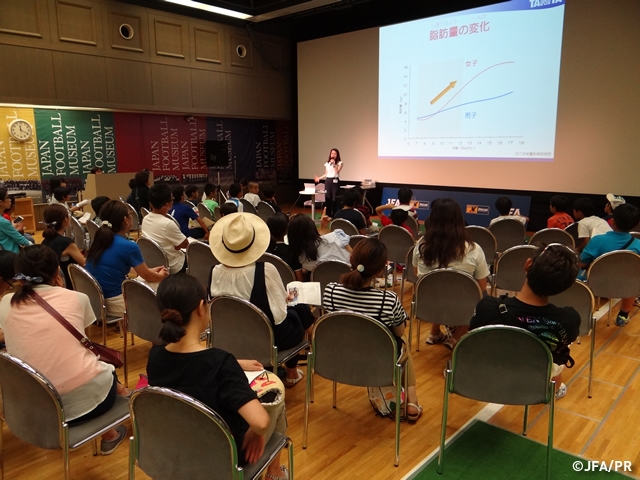 参加者は、各年代の日本代表選手の平均身長、体重、そしてポジションごとの筋肉の量の話や一流と呼ばれる選手は、小学生の時から毎日体重計に乗って自分の体について気配りをしているという話に感心したり、自分のからだづくりのためには運動だけでなく、食事のバランスや睡眠時間が必要という話に熱心に聞き入っていました。