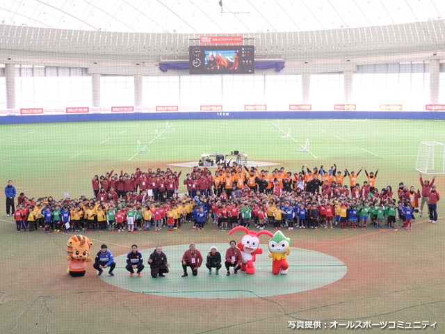JFAユニクロサッカーキッズは、6歳以下の未就学児を対象とした、だれでも参加できる楽しいサッカーフェスティバルです。12月18日(日)に開催した山口県/山口きらら博記念公園多目的ドーム会場では、638人が参加しました。スペシャルゲストのサッカー元日本代表名良橋晃さん、レノファ山口FCの一森純選手、宮城雅史選手と、チャレンジ1ねんせいの「コラショ」、レノファ山口FC「レノ丸」、山口県PR本部長「ちょるる」も、ピッチでプレーする子どもたちに声援を送ったり、一緒に写真撮影をしたりとイベントを盛り上げました。