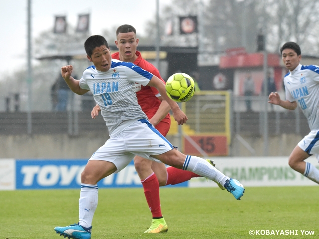 第1戦を白星でスタートした日本高校選抜の第2戦は、マインツとの対戦。立ち上がりは雨まじりでスリッピーな芝状態の中、テクニック・スピード・パワーで上回るマインツが日本ゴールを再三にわたり脅かしますが、GK廣末陸選手の好守によって失点を逃れます。そして前半17分、日本高校選抜はFW鳥海芳樹選手が巧みなドリブルで右サイドを突破。中央に上げたクロスにFW伊藤龍生選手が飛び込みゴールを決め、前半を1-0で折り返します。