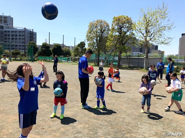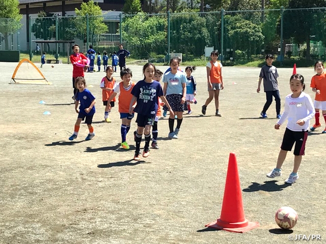 東京都荒川区南千住を拠点に活動している「南千住サッカー広場少女部」が4月23日(日)、12回目となる「JFAなでしこひろば」を開催しました。当日は晴天に恵まれ、23人もの女の子たちが楽しくボールを追いかけました。