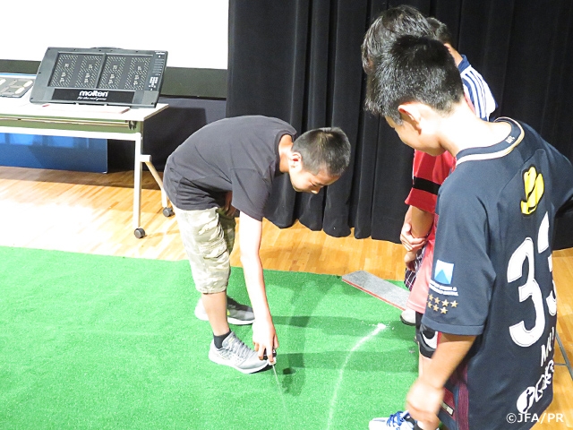 期間限定のスペシャルイベントとして3日目となった10日(木)は、「レフェリーの用具を教えてもらおう」と題して、JFAプロフェッショナルレフェリーの松尾一さんにお話をしていただきました。松尾さんは審判員が試合で使用する用具の実物をすべて紹介。実際に参加者が道具を装着し実演してみると、子どもたちだけでなく保護者の方々も、初めての経験に歓声を上げていました。