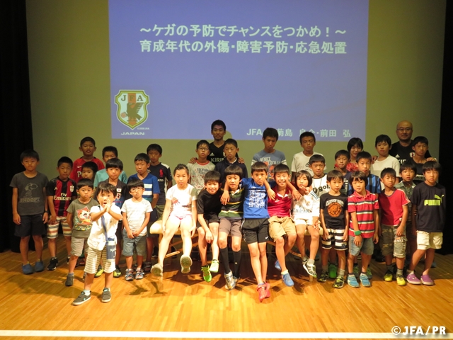 今回はSAMURAI BLUE(日本代表)アスレティックトレーナー 菊島良介さん・前田弘さんに、育成年代の選手によくみられるケガと、その予防や処置の仕方、注意点についてお話しいただきました。また、ケガ予防のためのストレッチや足首関節などのトレーニング方法の説明があり、参加者が実際にトレーニングを体験しました。最後はSAMURAI BLUE(日本代表)の試合後のロッカールームが利用前と変わらずきれいな状態になっていることや選手たちのオフ・ザ・ピッチでの行動を紹介し、日々の生活態度がサッカーをする上でいかに大切かというお話で締めくくりました。