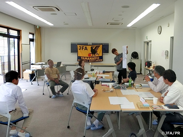 山梨県でのサテライト講座は、今回で6回目になりますが、毎年受講生の募集に苦労しています。今回は補講生を含めて10人集まりましたが、自発的に参加したのは4人、事務局がお誘いしたのは5人でした。当協会では、各種別を担っていく人材育成のためにサテライト講座を開催しています。サテライト講座に不安を抱きながらもセッションを重ねていくうちにビジョンが明確になり、最後のプレゼンでは自分のビジョンをしっかり描き、皆さんにきちんと伝えられたと感じました。開催中は、台風の影響で大雨の予報でしたが特に大きな問題もなく、懇親会でも講座を通して多世代の交流ができたことも皆さん喜んでいました。来年度以降もサテライト講座を開催し、山梨県サッカー協会の自主・自立のために各種別でビジョン・環境分析等ができる人材育成の取り組みに力を入れていきたいと思います。今回、参加していただいた皆さんのビジョンが達成されることを心よりお祈り申し上げます。