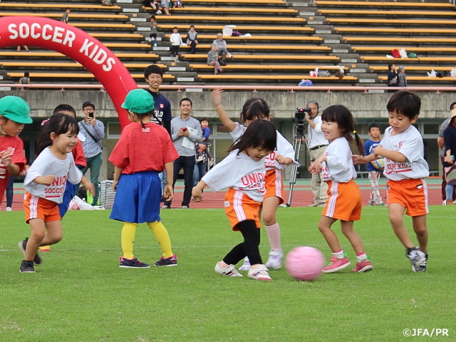 10月7日(土)、富山県/富山県総合運動公園陸上競技場でJFAユニクロサッカーキッズを開催しました。JFAユニクロサッカーキッズは、6歳以下の未就学児を対象とした、だれでも参加できる楽しいサッカーフェスティバルで、全国14会場で開催しています。富山会場では個人参加者29人を含む、60チーム536人が参加。参加者は6人制のミニゲームを各チーム3試合とキッズアトラクションコーナーを体験しました。