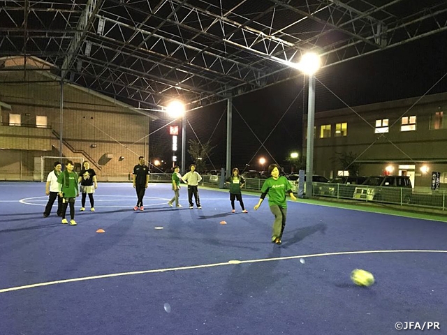 アルテリーヴォ和歌山アミーカが主催する「JFAなでしこひろば」が、10月5日(木)に和歌山県和歌山市の川辺レジャーセンターフットサル場で開催されました。30代から60代という幅広い年齢層が参加した今回は、さまざまなステップを組み合わせ楽しくランニングを行い、入念なストレッチでスタート。続いて基本的な技術のトレーニングを行いました。2人1組でインサイドキック、インステップキックでパスの練習をし、太ももでボールをトラップしてからのパスや、ヘディングにも取り組んでもらいました。