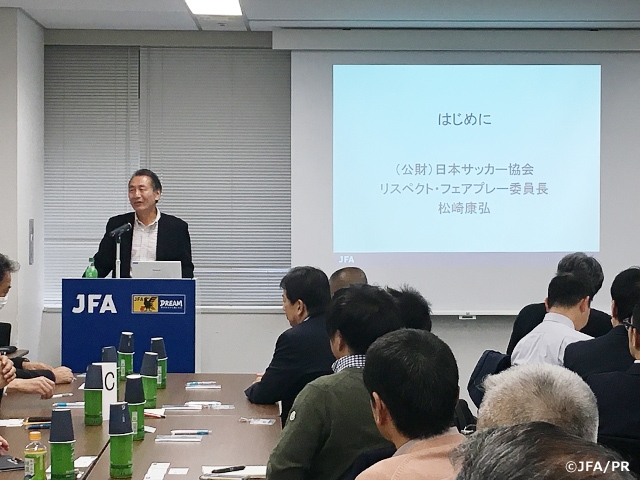 JFAは、2015年度からサッカーの活動現場における差別や暴力等をなくそうと、協会やクラブ、大会等にウェルフェアオフィサー認定制度を導入しています。同研修会は、同制度を開始してから毎年開催しているもので、各地域サッカー協会、都道府県サッカー協会、各連盟の担当者(ウェルフェアオフィサージェネラル)を集め、リスペクト・フェアプレーの考え方やウェルフェアオフィサーの役割について確認し合うものです。