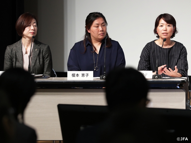 登壇者は、JOC理事・女性スポーツ専門部会部会長でありJFA理事を務める山口香さん、女子サッカージャーナリストの草分け的存在である早草紀子さん、元日本女子代表選手で現在U-16日本女子代表コーチを務める宮本ともみさん、レノファ山口女子U-18コーチで長年四国での女子サッカー発展のために尽力された猿澤明子さん、国際審判員の山下良美さん、フットサル日本女子代表選手の櫻田未来さん、元日本女子代表選手でJFA女子副委員長の手塚貴子さん、アルビレックス新潟レディース強化担当の榎本恵子さんで、モデレーターはジェフユナイテッド市原・千葉レディースマネージャーの小林美由紀さん、今井純子JFA女子委員長が務めました。登壇者は女子サッカーの魅力や、女性ならではのライフイベントについて議論を深めました。