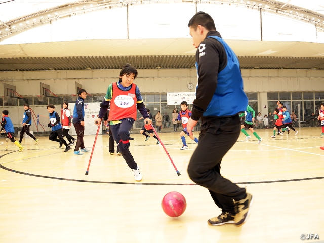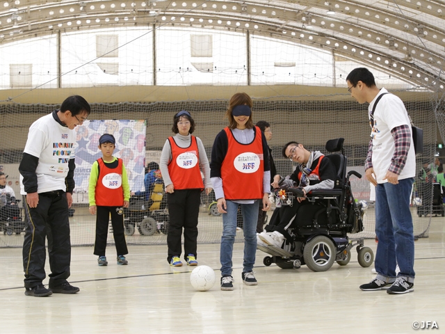 この日は、JIFFに加盟する障がい者サッカー7団体と在京のJリーグ、なでしこリーグ、Fリーグのクラブが協力し、小学生による「インクルーシブフットボール」と一般参加の「障がい者サッカー体験会」を午前の部、午後の部の2回に分けて行いました。北澤豪JIFF会長や、原博実Jリーグ副理事長も、一緒に体験会や試合に参加し、障がいの有無に関係なく、サッカーの楽しさを自ら実践し、だれもがその素晴らしさを感じることのできる一日となりました。
