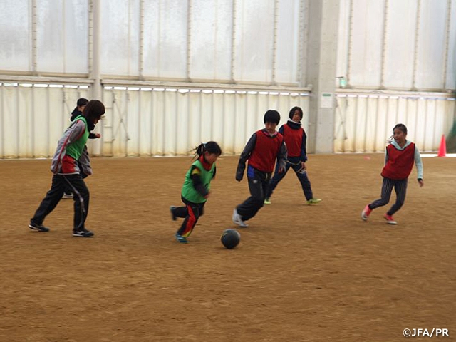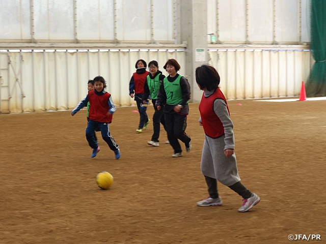 淡路市立一宮中学校サッカー部が主催する「JFAなでしこひろば in 淡路 あつまれ!!アスパ五色」が2017年12月30日(土)、31(日)に、第26回全日本高等学校女子サッカー選手権大会の1回戦2回戦の開催に合わせて、兵庫県洲本市五色町で実施されました。事前に淡路島内の新聞にて大会の広告とともに告知を行い、さらに、洲本市内の教育関係先にチラシの配布を行いました。当日は淡路島内の女性、女の子約20人が集まりました。五色フットボールクラブの方や島内で活動している島女子サッカー~Awaji LSC~の選手が中心に指導を担当しました。参加者はまず、交流を活発にするためのアイスブレイクとしてじゃんけん3連勝ゲーム、チェンジ組おにごっこゲームからスタートし、その後、参加者を各種年代必ず入るよう3チームに分けゲームを行いました。3チームでそれぞれの対戦相手とゲームを行ったのち、各種年代別に3チームを作り再度ゲームを行いました。参加者の年齢幅が広く細かいメニュー指導よりも、交流を基本としたプログラムでしたが、ゲームになると勝ちにこだわり勝負を楽しむ様子が見られるなど、参加者のサッカーを楽しんでいる様子がとても印象的でした。