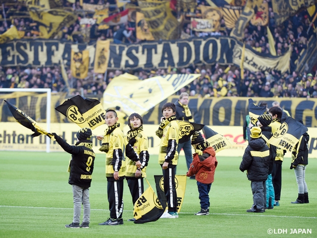 香川真司選手が所属するボルシア・ドルトムントのブンデスリーガ第22節ハンブルガーSV(HSV)戦をスタジアムで観戦。試合前には、チームを代表して4名が、ピッチ上でフラッグキッズとして、8万人以上のファンを前に選手を出迎える貴重な体験をしました。
