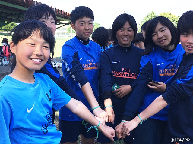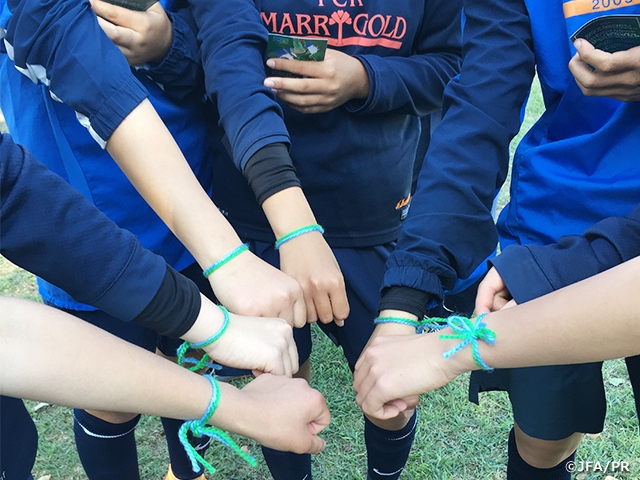 この日は、熊本県菊池郡菊陽町で、飯川乙女さんが所属するFCKマリーゴールド熊本の協力を得て、大会のシンボルである青と緑のブレスレット交換が選手たちによって行われました。ブレスレットの青のラインは平和な空を意味し、緑のラインは誰もが参加できるサッカー場を意味しています。こうしたINTERNATIONAL DAY OF FOOTBALL AND FRIENDSHIPは、6月のプログラム開始を前に、参加を記念する国内イベントとして、それぞれの211の国と地域で行われています。