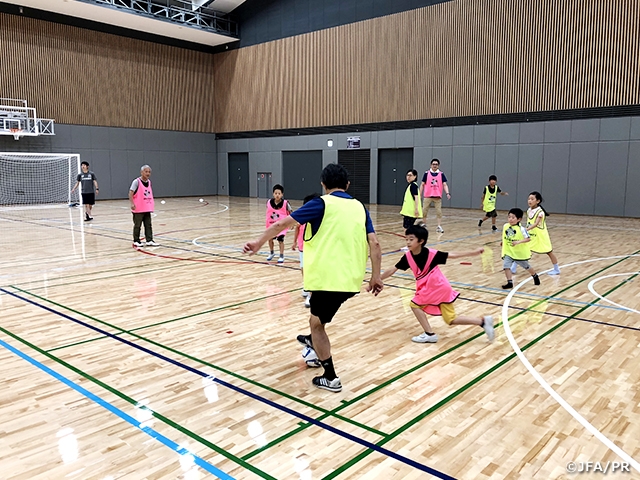 JFAのある東京都文京区では、6月30日(土)に行われた文京スポーツセンターリニューアルイベントの一環としてウォーキングサッカー体験会を行いました。JFAは、文京LBレディースの選手らとともに運営に協力しました。この日は、「スポーツ×ドイツホストタウンフェスティバル」と題し、文京区が東京オリンピック・パラリンピック競技大会でホストタウンになっていることにちなみ、ドイツの食と文化を楽しむ催しが開かれました。このイベントの来場者の中から約180名が体育館に集まり、普段スポーツにあまり接することのない子どもも含めて、気軽にサッカーの楽しさに触れました。