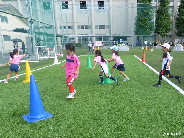 藤枝順心ガールズサッカースクールが主催する「JFAなでしこひろば in 藤枝順心ガールズサッカースクール」が7月22日(日)に、藤枝順心高等学校人工芝グラウンドにて開催されました。藤枝順心ガールズサッカースクールでは月に2回のペースでなでしこひろばを開催をしていますが、前回、前々回と連続で雨天中止となり、久しぶりの開催日で多くの子どもたちが早朝(朝8時)から集まりました。