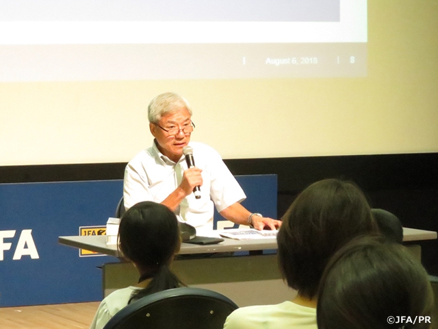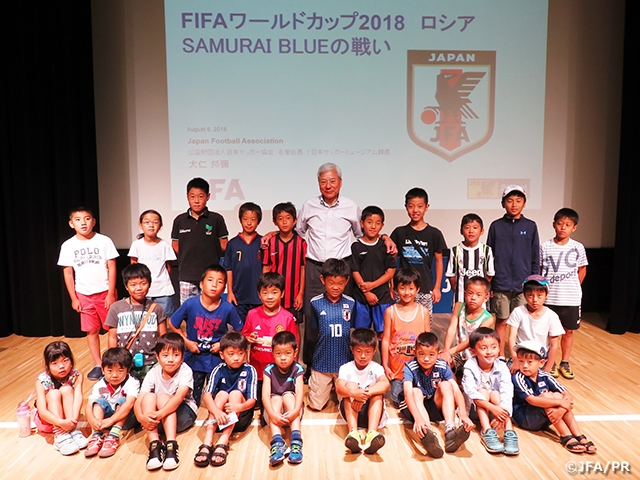 この日のトークイベントは「2018 FIFAワールドカップロシア 日本代表の戦い」と題し、元日本代表選手で、JFA技術委員長、JFA会長を歴任された日本サッカーミュージアム大仁邦彌館長が登壇しました。ワールドカップでの日本代表の4試合について、大仁館長ならではのトークが繰り広げられ、参加した子どもたちは熱心に聞き入っていました。