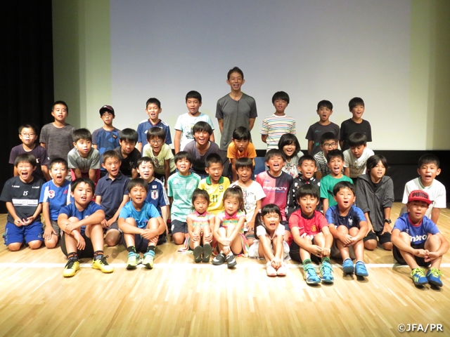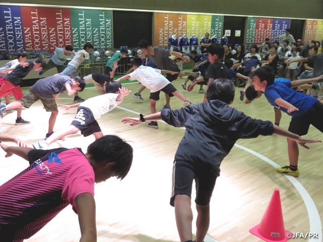 この日は「親子でできる ケガをしない体づくり」と題して、SAMURAI BLUE(日本代表)コンディショニングコーチの早川直樹さんが登壇し、アスリートのケガの予防のための日常生活の注意点をお話しました。SAMURAI BLUEの選手たちが、FIFAワールドカップの試合直前にモチベーションアップのために見た映像なども披露され、子どもたちだけではなく、保護者の方々も熱心に見入っていました。その後は、実際にSAMURAI BLUEでも取り入れられているコンディション作りのためのウォーミングアップなどを子どもたちに指導し、体づくりを学びました。
