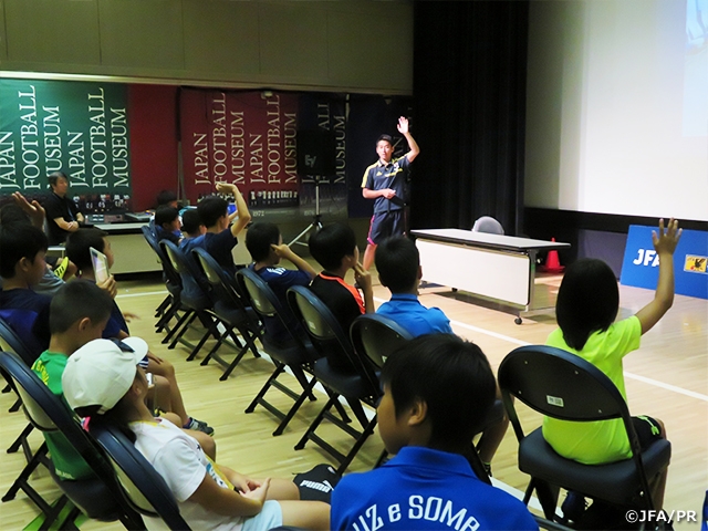 日本サッカーミュージアムは、子どもたちにサッカーへの興味、関心を高めてもらうことを趣旨とした、夏休み自由研究イベントを開催しています。8日(水)には、期間限定のスペシャルイベントとして、「ケガの予防でチャンスをつかめ!育成年代の外傷・障害予防・応急措置」と題して、SAMURAI BLUE(日本代表)アスレティックトレーナーの前田弘さん、菊島良介さんが、育成年代の選手によくみられるケガと、その予防や処置の仕方、注意点についてお話しました。