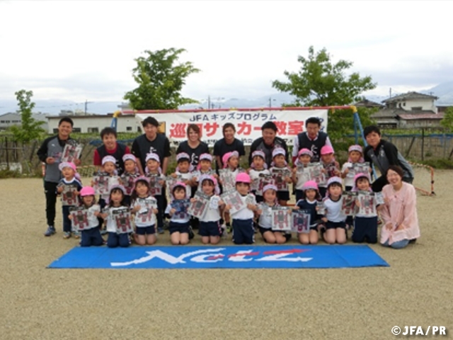JFAでは、各都道府県のキッズ委員会を中心に「巡回指導」を各地で開催しています。「巡回指導」では、各都道府県協会の巡回指導員が幼稚園や保育園、小学校に出向き、子ども達にサッカーを楽しんでもらう各種プログラムを提供しています。サッカーの経験や知識があまりなく、なかなか自信を持って教えることができない保育士の皆さんや先生方に、サッカーの指導を得意とするスタッフが加わって、子どもたちがボールを使って体を動かす時間を設ける取り組みです。 ここでは各地での巡回指導の様子をご紹介します。