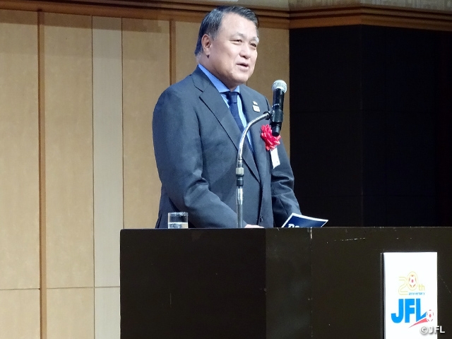 まず最初に行われた今シーズンの表彰式では、団体賞と個人賞の表彰を行いました。そして、多くの関係者が集まったJFL20周年記念祝賀会では、主催者挨拶に続き来賓を代表して、JFA田嶋幸三会長が挨拶。最後に第20回JFL優勝チームの記念撮影とMVPの発表等を行いました。