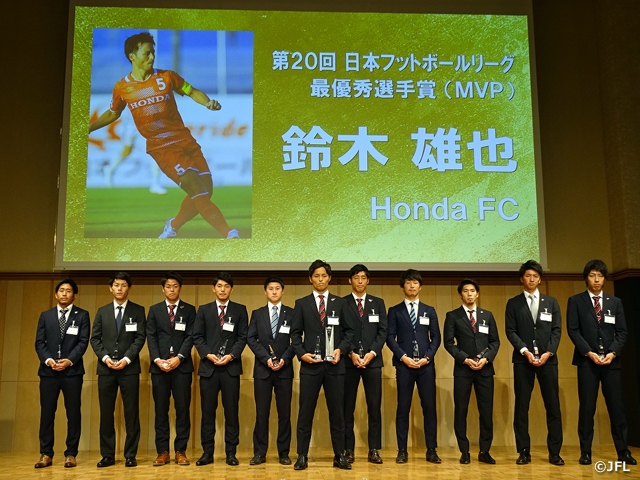 JFL20周年の節目の年にこのような賞をいただき、うれしく思います。Honda FCのチームメイト、スタッフ、事務局他、チームに関わる全ての方に感謝しています。特にHonda FCのチームメイトには感謝しております。日頃より質の高いトレーニング、チーム内での競争があっての成果だと思います。今後とも競争し続けて、切磋琢磨して頑張って行きましょう。そしてJFLのチーム、ピッチ上ではライバルではありますが、ピッチを離れればJFLとしてサッカー界を盛り上げる仲間です。僕はそう思っています。そして多くの人達がかかわるJFL、もっと横のつながりを深め今後もさらなる発展を目指し盛り上げていきたいと思います。自分もピッチ内外ともに頑張っていきたいと思います。そして最後になりましたが、ヴァンラーレ八戸のみなさん、J3入会おめでとうございます。今後もサッカー界を盛り上げる仲間として活躍を期待しています。 そして、また来年の表彰式では、チーム全員で参加できるように頑張ります。