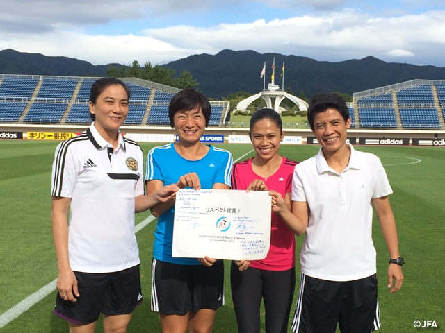 「JFAリスペクト フェアプレーデイズ2014差別、暴力のない世界を!」の活動の一環として、9月5日(金)、9日(火)のキリンチャレンジカップ2014 、9月13日(土)のなでしこジャパンワールドマッチを担当したレフェリーチームもリスペクト宣言を行いました。