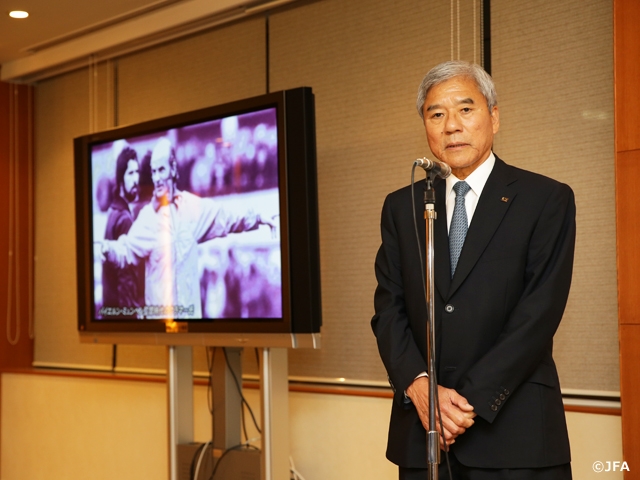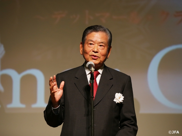 式典では、出席者全員で黙祷を捧げた後、当時、日本代表のコーチ兼通訳としてクラマーさんと歩みをともにした岡野俊一郎最高顧問が挨拶に立ち、当時を懐かしく振り返りました。岡野最高顧問は、コーチ術しかなかった当時の日本に、クラマーさんが100年経っても変わらぬ“コーチ学”を伝授してくれたこと、また、サッカーだけでなく日本のスポーツの発展に多大なる功績を残したことについて感謝の意を表しました。続いて東京オリンピックに選手として出場した川淵三郎キャプテンが登壇。クラマーさんの薫陶を受けた仲間が久しぶりに再会できたことを喜ぶとともに、「人生哲学も教えてくれた恩人」と懐かしみました。