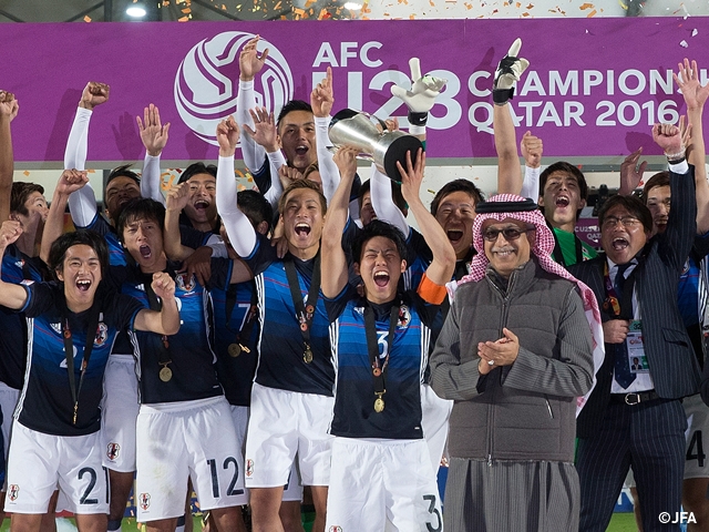 上位3チームにリオデジャネイロオリンピック出場権が与えられる本大会においてU-23日本代表は、準決勝のイラク戦において原川力選手がアディショナルタイムに得点を決め、劇的勝利をおさめオリンピック出場権を獲得いたしました。そしてアジアの頂点をかけ、U-23日本代表は韓国との決勝戦に臨み、2点を先制されたものの、浅野拓磨選手の2得点、矢島慎也選手の得点で3対2の逆転勝利を決め、大会優勝を果たしました。