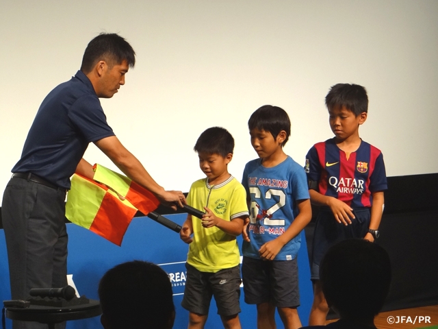 今回は 「審判員のお仕事」としてプロフェッショナルレフェリー 扇谷健司さんにお話をしていただきました。Jリーグ審判員が実際に使用する、レフェリー間の「コミュニケーションシステム」の紹介や、アシスタントレフェリーが使用するフラッグに装着されている「シグナルビープ」の実物を実際に子どもたちが装着しての実演など、子どもたちだけでなく、保護者の方々も初めての経験に場内は歓声が上がっていました。扇谷さんの失敗談などで、参加者はより身近にサッカーの審判員の仕事に触れることが出来ました。