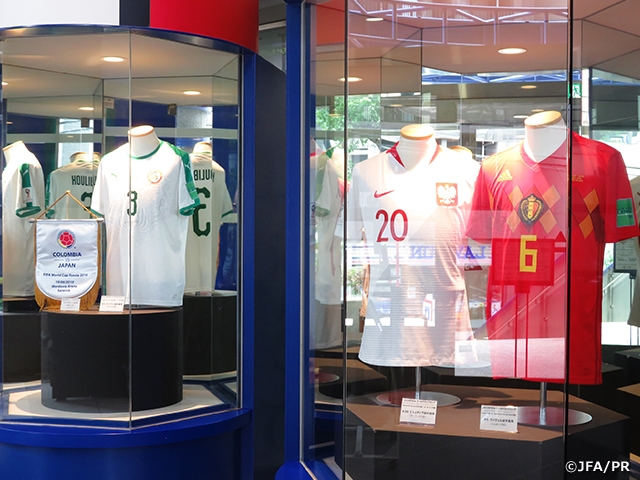 日本サッカーミュージアム1階エントランスにて、2018 FIFAワールドカップロシアの対戦国ユニフォームを、また、地下2階有料フロアでは、バドワイザー・マン・オブ・ザ・マッチトロフィー(グループH第1戦vsコロンビア/#15 大迫勇也選手受賞)、大会使用球、ADカード(#4本田圭佑選手、#9岡崎慎司選手、#10香川真司選手、#11宇佐美貴史選手、#14 乾貴士選手、#15 大迫勇也選手、#16 山口蛍選手、#19 酒井宏樹選手、#23 中村航輔選手着用/サイン入り)を追加展示いたしました。