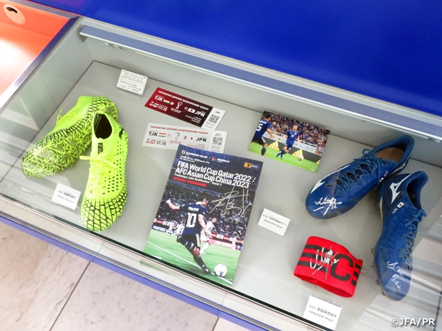 日本サッカーミュージアム1階エントランスにて、10月10日(木)および15日(火)に開催された2022FIFAワールドカップカタールアジア2次予選兼AFCアジアカップ中国2023予選のユニフォーム(森保一監督、日本代表選手サイン入り)、公式試合球(同サイン入り)、使用球、プログラム(#10 中島翔哉選手サイン入り)、キャプテンマーク(#22 吉田麻也選手サイン入り)、シューズ(日本代表各選手着用/サイン入り)を展示中です。