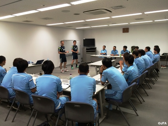今年度の受講生20名を前に行った約90分の講義では、ボールに触れる回数がサッカーに比べて約6倍というフットサルの競技特性を踏まえて、育成年代でフットサルに取り組む重要性を海外の事例を交えながら話しました。また、昨今のトップレベルのサッカーの試合においても、トゥキックや足の裏を使ったボールコントロールといったフットサル特有のプレーが数多く見られることなどを、編集した映像で見せて、フットサルの技術・戦術の有効性を共有しました。