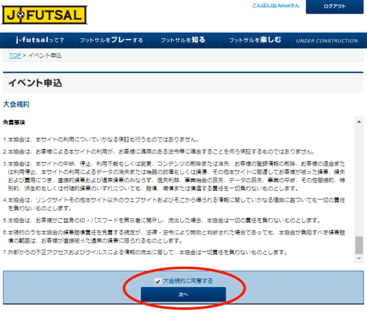 (2)大会規約をご確認いただき、ご同意いただける場合はチェックボックスにチェックを入れ、「次へ」をクリック。