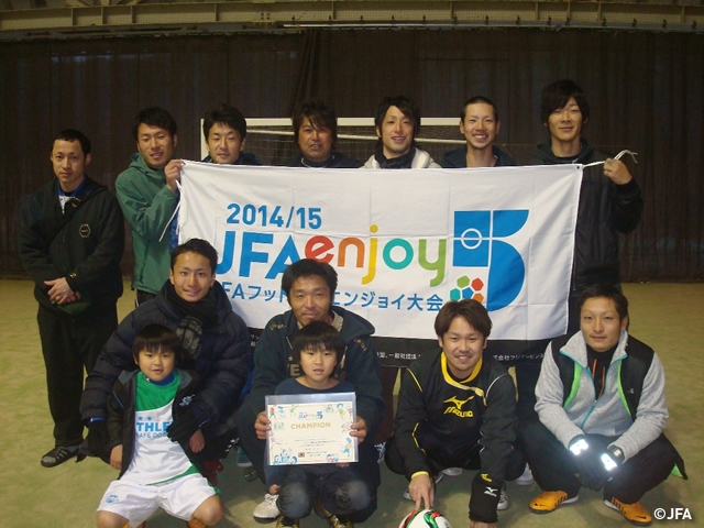 全国各地の民間フットサル施設などで熱戦が繰り広げられている「2014/2015 JFAエンジョイ5」。12月14日(日)、島根県益田市のひだまりパークみと さくらドームでエンジョイカテゴリーを開催し、JFAフットサル総合サイト「j-futsal」から登録・エントリーした16チームが参加しました。エンジョイカテゴリーでは、32施設で開催されているファーストステージ各会場の優勝チームをファイナルステージに招待します。男女や年齢の制限がなく、エンジョイ志向のチームを中心に参加しやすいカテゴリーとなっています。