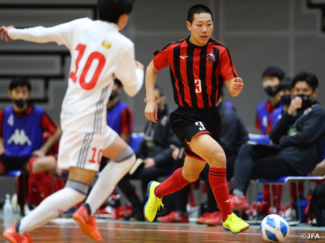 北海道コンサドーレ旭川(北海道1)と松山城北FC(四国/愛媛)の試合は、1次ラウンドを3連勝で勝ち上がったコンサドーレ旭川が、強さを見せつけます。松山城北の亀田貴志監督が「先制するチャンスが何本かあった中で、そこを決め切れずに(勢いに)乗ることができなかった」と振り返ったように、コンサドーレ旭川は序盤のピンチをしのぐと、第1ピリオド6分にゴール正面でボールを受けて反転したFP中田悠惺選手の先制点を皮切りに得点を重ねていき、試合を3-0で折り返します。第2ピリオドに相手のバックパスから得た間接FKから中田選手が2点目を決めるなど2点を加え、5-0の勝利を収めました。