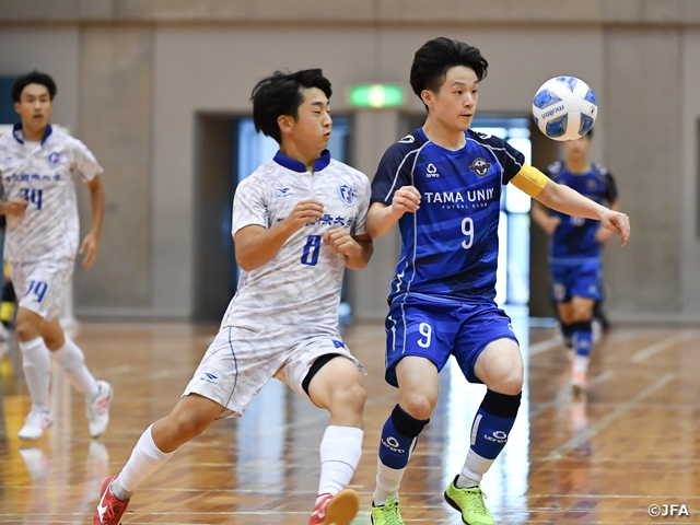東京国際大学サッカー部(関東1/埼玉)と多摩大学フットサル部(関東2/東京)という関東大会の決勝と同一カードとなった3位決定戦では、関東大会決勝で3-5と敗れていた多摩大が、自分たちの力を見せつけました。8分にカウンターから荒木辰文選手のパスを受けた峰嶋歩夢選手が先制ゴールを挙げると、13分には大野大選手が立て続けに2点を連取。18分にも藤本毅選手の左サイドの突破から最後は荒木選手が追加点を決め、第1ピリオドだけで4-0と大量リードを奪いました。