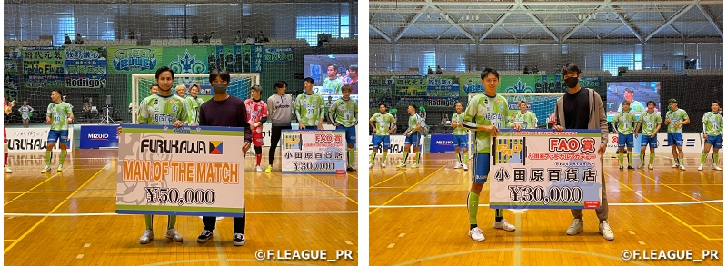 ここ2試合、勝利から遠ざかっていた湘南ベルマーレは、ホームにシュライカー大阪を迎えました。3分、大阪のキックインをカットした本田真琉虎洲選手が自らゴールを突き刺し先制に成功すると、6分にはGKフィウーザ選手のロングスローを堀内迪弥選手が落とし、内村俊太選手が叩き込んで一気に2点をリードしました。2点を追う大阪は7分、齋藤日向選手が起点となり計盛良太選手が1点を返します。ここから巻き返したい大阪に対し、18分には湘南の津田京一郎選手が追加点。3-1で第1ピリオドを折り返しました。第2ピリオドでも湘南の勢いは止まらず、25分には本田選手のアシストからロドリゴ選手がゴール。さらに31分にはセットプレーから堀内選手がゴールを奪い、点差が開きます。4点を追う苦しい状況となった大阪は、9分を残し磯村直樹選手をGKに置くパワープレーを開始。しかし、開始37秒で湘南にパワープレー返しを浴びてしまいます。タイムアウトを取り、パワープレーのポジションチェンジや通常攻撃との組み合わせで湘南ゴールに迫る大阪は、残り30秒で野村悠翔選手が1点を奪いますが追撃及ばず6-2で試合終了。湘南が3試合ぶりの勝利を挙げました。試合終了後には、Jリーグ・湘南ベルマーレ所属の谷晃生選手、平岡太陽選手がサプライズで登場し、試合で活躍した津田選手、本田選手を表彰するプレゼンターを務めました。