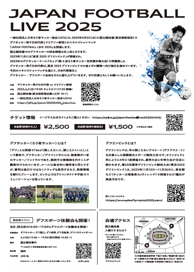 4月2日(水)に国立競技場で「JAPAN FOOTBALL LIVE 2025」が開催されます。この試合はデフサッカー男子日本代表とクリアソン新宿のエキシビションマッチです。デフサッカーの歴史上、日本サッカーの聖地「国立競技場」での開催は初めての試みです。