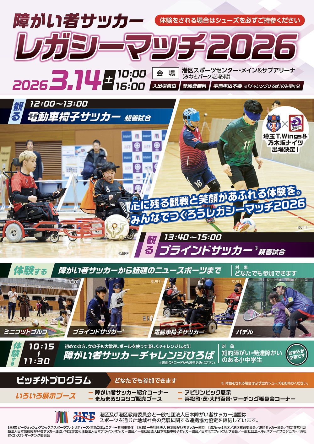 港区/港区教育委員会/港区サッカー協会/特定非営利活動法人日本知的障がい者サッカー連盟/特定非営利活動法人日本ブラインドサッカー協会/一般社団法人日本電動車椅子サッカー協会/日本ミニフットゴルフ協会/一般社団法人キッズブーケプロジェクト/浜松町・芝・大門・マーチング委員会