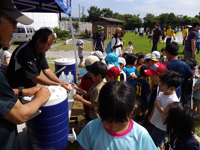 毎回運営の手伝いをしながら、1~2年生を引率して参加しています。子どもたちは、普段あまり触れ合うことのない大学生や高校生と一緒にサッカーをすることが楽しいようです。恒例のお昼にみんなで食べるカレーが一番の楽しみです。