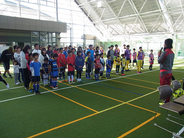まずヴィンセドール白山さんによる、準備運動も兼ねたフットサルクリニックがあり、楽しいクリニックのおかげで会場全体が和み、初めて参加する子供達にも笑顔が見られました。その後試合が始まり、普段の練習の成果を家族に見せようと頑張る子供達、運動不足解消やまだまだ子供達に負けまいと奮闘するお父さん方、いつもは応援ですが緊張しながらも一緒に出場しているお母さん方の姿が見られ、とても和気藹々とした賑やかな大会になりました。