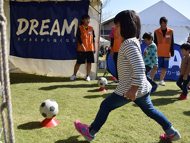 地元大手企業のお祭りに協賛させて頂く形で、JFAフットボールデーを開催させて頂きました。地元地域のお子様連れファミリー方の来場が多く、多くの出店やアトラクションブースがある中で、WFAのフットボールデーブースは大変盛況となり、キッズ年代の女の子を中心にキックターゲットを楽しんで頂き、サッカーの魅力を感じて頂く事が出来ました。女の子に比べ男の子は恥ずかしがり屋の様で参加にも遠慮がちですが、女の子は案外積極的でした。