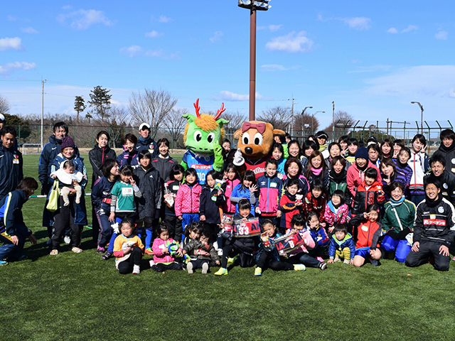 2月ではめずらしいぽかぽか日和に、県内の親子・レディースの方々に参加して頂き、サッカー教室を開催しました。地域の鹿島アントラーズ、水戸ホーリーホックコーチに指導をしてもらい楽しく、充実したクリニックになりました。両チームマスコットのしかこちゃんとホーリーくんも飛び入りGKでミニゲーム参戦しました。