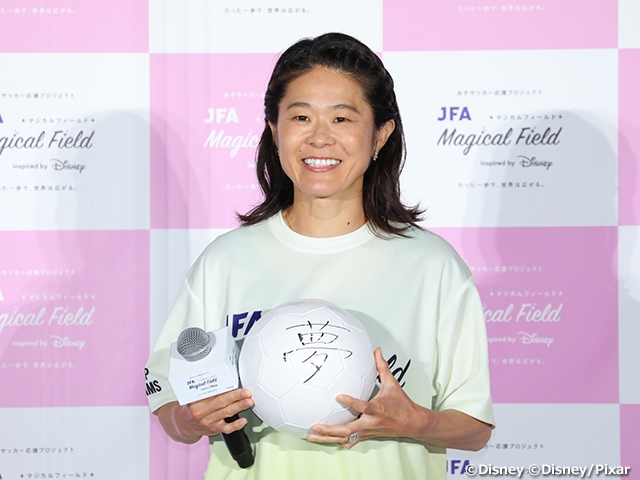 続いて、「JFA Magical Field Inspired by Disney」プロジェクトキャプテンに就任された、澤穂希さんが登壇。澤さんは、本プロジェクトについて「私はサッカーを通じて、何かを始めるためには、まず、その第一歩を踏み出すことが大切だと学びました。ディズニーさんと一緒に、すべての女性が新たに挑戦することや、そのために勇気を持つための後押しができれば幸いです」と語りました。そして今回のイベントに参加する子どもたちにはプロジェクトを通じて「初めてサッカーに挑戦するお子さんもいると思いますが、サッカーの楽しさや何かに挑戦することの楽しさを感じてもらえたら嬉しいです」と話す澤さん。今後の澤さんに期待することとして田嶋は、「日本の女子サッカーの象徴的な方と一緒に取り組めることに感謝していますし、同じ世代のお子さまもいらっしゃいますから、ぜひどこかのイベントにもお越しいただきたいです」と語りました。また井原さんからも、「私自身、澤キャプテンの“苦しいときは私の背中を見なさい”という言葉が深く心に刻まれております。澤さんがサッカーを始められた頃、おそらくうまくいかなかったこともあるかと思いますが、一つずつできることを増やし自信にして、勇気を持っていろんなことにチャレンジをして成長されたかと思います。このプロジェクトを通じて、子どもたちには“勇気”と“優しさ”を体現された澤さんの背中をみて、ぜひ、楽しい経験を始めて欲しいと思います」と、期待のメッセージが送られました。
