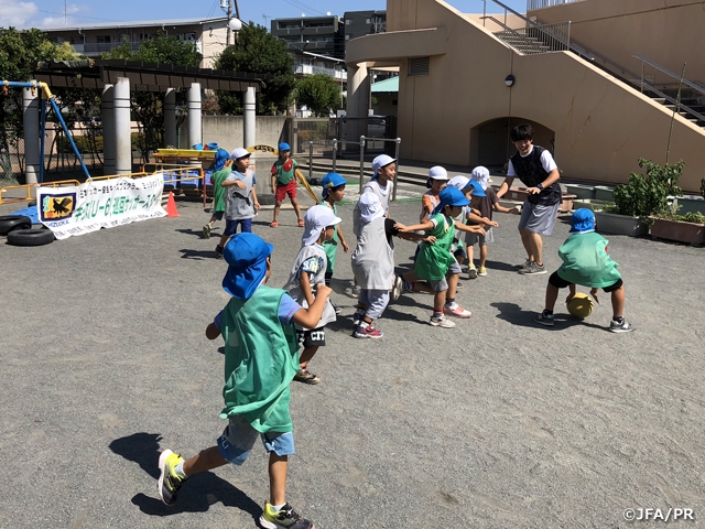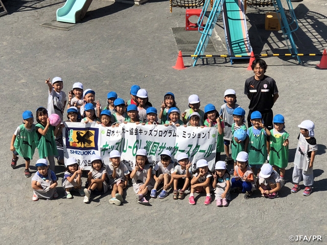 日本サッカー協会は、各都道府県のキッズ委員会を中心に「巡回指導」を各地で開催しています。「巡回指導」では、各都道府県協会の巡回指導員が幼稚園や保育園、小学校を訪問し、子どもたちにサッカーを楽しんでもらえる各種プログラムを提供しています。サッカーの経験や知識があまりなく、なかなか自信を持って教えることができない保育士の皆さんや先生方に、サッカーの指導を得意とするスタッフが加わって、子どもたちがボールを使って体を動かす時間を設ける取り組みです。今回は9月に静岡で行った巡回指導の様子を紹介します。