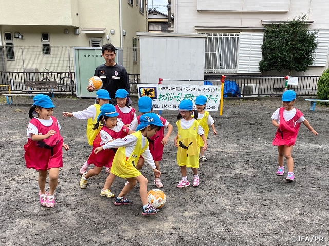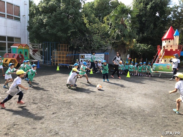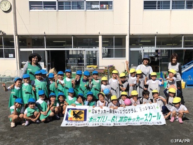 日本サッカー協会(JFA)では、各都道府県のキッズ委員会を中心に「巡回指導」を各地で開催しています。「巡回指導」では、各都道府県協会の巡回指導員が幼稚園や保育園、小学校に出向き、子どもたちにサッカーを楽しんでもらう各種プログラムを提供しています。サッカーの経験や知識があまりなく、なかなか自信を持って教えることができない保育士の皆さんや先生方に、サッカーの指導を得意とするスタッフが加わって、子どもたちがボールを使って体を動かす時間を設ける取り組みです。 ここでは10月に行われた各地での巡回指導の様子をご紹介します。