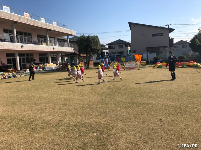 「巡回指導」では、各都道府県協会の巡回指導員が幼稚園や保育園、小学校に出向き、子どもたちにサッカーを楽しんでもらう各種プログラムを提供しています。サッカーの経験や知識があまりなく、なかなか自信を持って教えることができない保育士の皆さんや先生方に、サッカーの指導を専門とするスタッフが加わって、子どもたちがボールを使って体を動かす時間を設ける取り組みです。ここでは各地での巡回指導の様子をご紹介します。