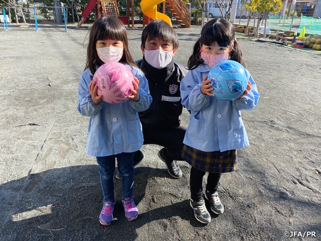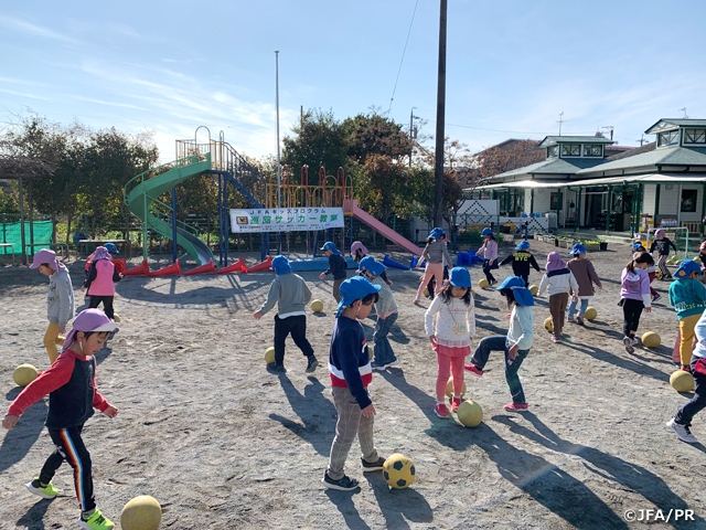 「巡回指導」では、各都道府県協会の巡回指導員が幼稚園や保育園、小学校に出向き、子どもたちにサッカーを楽しんでもらう各種プログラムを提供しています。サッカーの経験や知識があまりなく、なかなか自信を持って教えることができない保育士の皆さんや先生方に、サッカーの指導を専門とするスタッフが加わって、子どもたちがボールを使って体を動かす時間を設ける取り組みです。ここでは各地での巡回指導の様子をご紹介します。