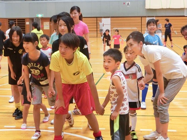 夏休み最後の日曜日だったので、いつもより参加者が少ないのが気になったが、フォーレちゃんや女子委員会所属の中学生チームの参加も得られ「フォーレちゃんと遊ぼう」「親子でボール遊び」「ミニゲーム」の内容で盛り上がった。フォーレちゃんとのじゃんけんゲームでは、体全体で」表現する方法を取り入れ」たり、「落ちた、なにが落ちた」のリズムに合わせフォーレちゃんが表現する動きを子どもたちがじっと見て判断し言葉にできるようにしたりして遊びの中でも体全体を使うこと、見て判断することにつばがる内容にした。親子でのボールの奪い合い、二人で協力して輪をくぐる、川わたりをして次のお友だちにタッチするなど楽しむことが出来た。ミニゲームは、幼児、小学生で分かれてそれぞれの子ども同士、親子での対決をした。また、最後はスタッフ vs お父さんお母さんチームでの対戦を、子どもたちが声援する場面も作りながらサッカーをする、声援する楽しみ方を学ぶ機会にもなった。