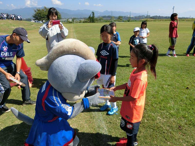 グランドの都合で急に開催日、場所が変わったので参加人数が確保できるか心配でしたが、フォーレちゃんや女子委員会所属の中学生。社会人のチームの参加も得られ、「フォーレちゃんと遊ぼう」、「親子でボール遊び」「ミニゲーム」の内容で盛り上がりました。フォーレちゃんとの『じゃんけんゲーム』では、足及び体全体で表現する方法を取り入れて体を動かしたり、『ウルトラマン』になろうでは「ウ~シュワッチ」の掛け声で3つのポーズから自分で選択して表現するなど、遊びの中で体全体を使うこと、予測して行動に移すなどウォーミングアップにつながる内容にしました。ボールの奪い合い、距離別コーン当て、ボール集めのゲームなど親子で、又はお姉さん達と楽しむことが出来ました。ゲームではお父さん、お母さんを応援して自ら頑張ること、また声援をすることの大切さを学ぶ機会にもなりました。
