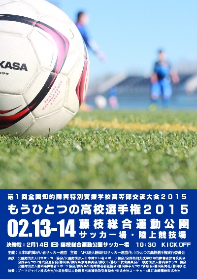 第1回全国知的障害特別支援学校高等部交流大会2015「もうひとつの高校選手権2015」(日本サッカー協会後援)が2月13日(土)から2月14日(日)、静岡県の藤枝総合運動公園 サッカー場・陸上競技場にて開催されます。