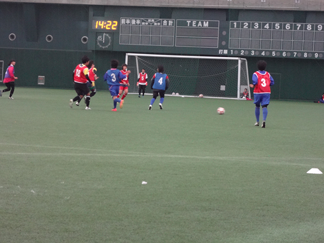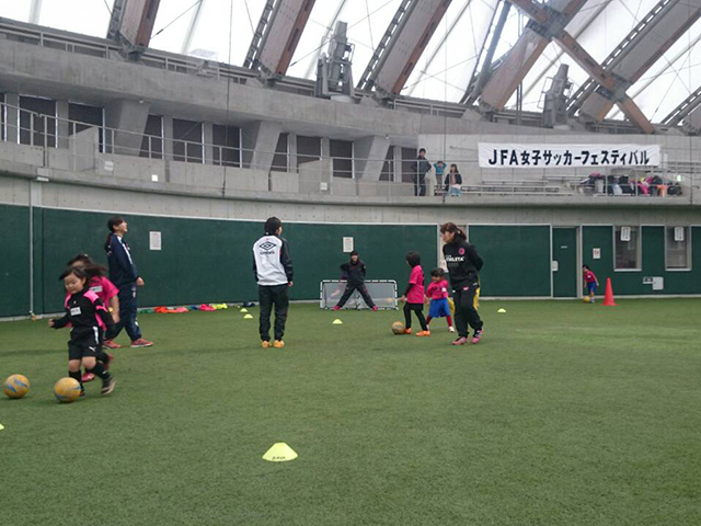 冬場の雨の中でしたが、ドーム施設を利用して、午前中は幼児から中学生年代の幅広い女子選手が集まってグラスルーツ形式でのフェスティバルを開催しました。午後からは、中学生~20歳代の選手120名によるランダム選出のチームを作り、対抗戦を行いました。